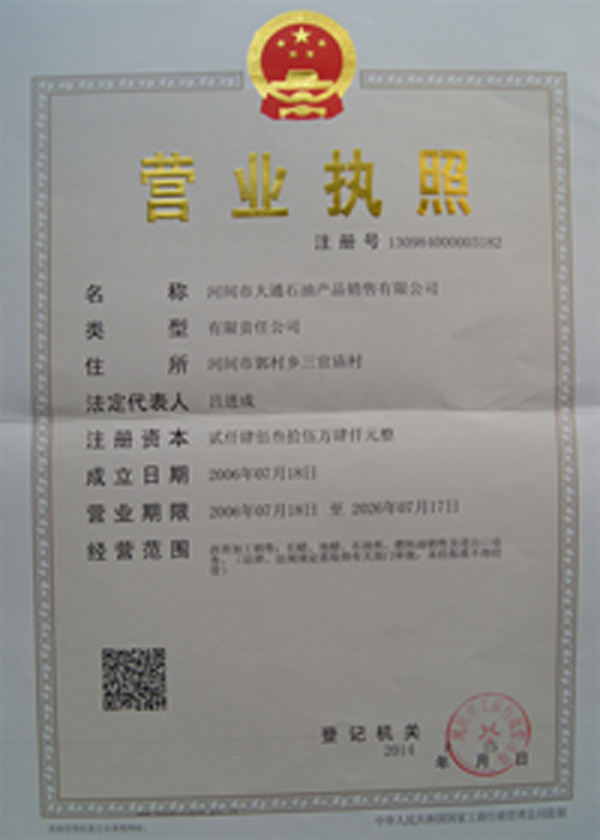 證書介紹 河間市大通石油產(chǎn)品銷售有限公司