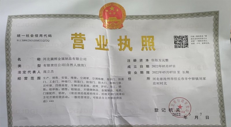 證書介紹 公司生產(chǎn)、銷售、安裝、維修:空調(diào)罩、空調(diào)格柵、卷簾門、快速門、工業(yè)門、伸縮門、簡(jiǎn)易門、防盜門、防火門、斷橋門窗、百葉窗、擋煙垂壁、車輛識(shí)別系統(tǒng)、道閘、護(hù)欄;加工、銷售:鋁單板;銷售:鋁制品、不銹鋼制品、金屬制品、電機(jī)、門窗配件、鋁材。
