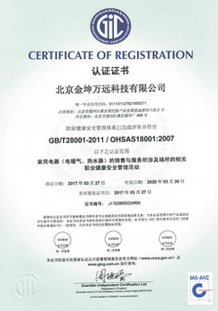 職業(yè)健康安全管理體系認證證書(OHSAS18001)