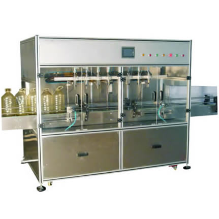 本設備適合于各種食用油類的灌裝,如花生油、豆油、菜籽油、色拉調和油、麻油、香油、食用調和油。此設備是灌裝、燈檢、自動輸送、自動感應壓蓋于一體的自動油類灌裝充填機械。適合于批量較大的裝油、灌油廠分裝。