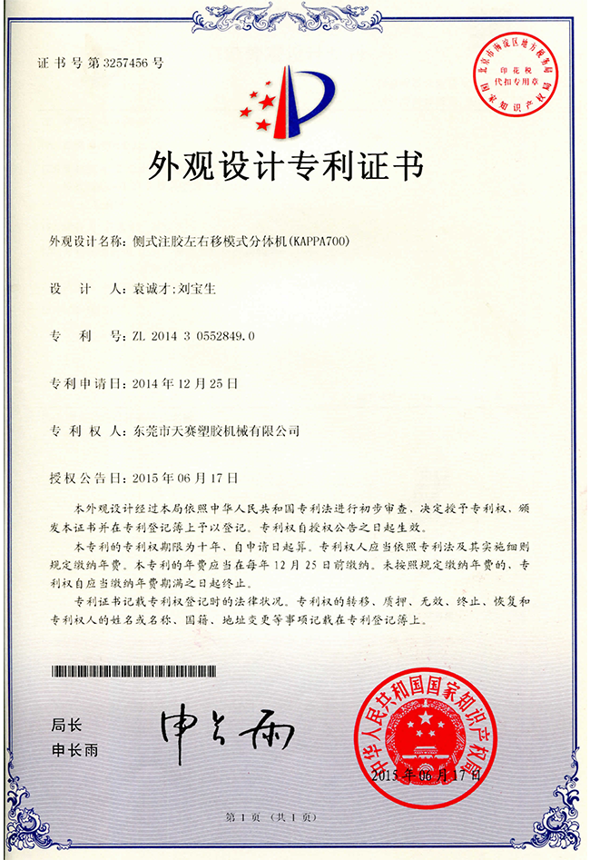 側式注膠移模式分體機(KAPPA700) 外觀設計專利證書
