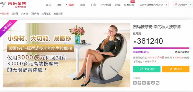 截止今天眾籌結(jié)束,總共籌得361240元,項(xiàng)目進(jìn)度遠(yuǎn)超預(yù)期261%,共有2514名消費(fèi)者支持,再次感謝新老客戶對PANASEIMA品牌的關(guān)注與支持,PANASEIMA顛覆了傳統(tǒng)按摩椅,承諾僅用3000多元帶給你30000多元高端按摩椅的無限舒爽體驗(yàn)!