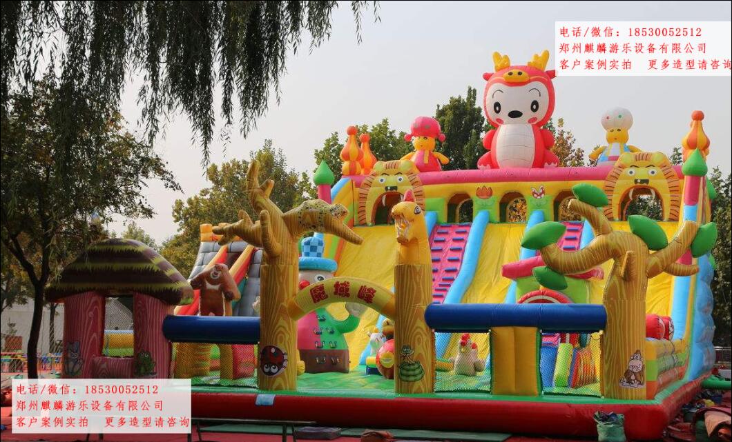 充氣城堡安全性保障:1.每兩個造型之間和造型與護欄之間都有一定的安全距離。(1米)2.產(chǎn)品造型逼真,顏色搭配美觀。而且能夠充分保證游玩者的安全3.防風鼻防止被風刮倒。