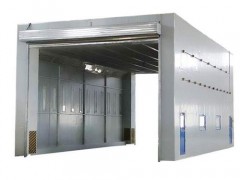 整體移動式噴漆間的設計目的,是為了滿足較大型工件 打磨或噴漆的需要。一般情況下每套房體對應2~3個排風凈化工位,哪個工位上的工件需要噴漆時,房體則行走移動到那個工位,其他工位可以繼續打磨工作,待 房體內的工件噴漆完畢后,再控制移動房體行走到打磨完畢后的工件工位,如此設計可以實現大型工件的不間斷連續噴漆工作。房體為鋼結構構造,房體立柱下面設置有兩臺電動驅動行走機構,行走機構沿地面軌道行走。移動房體兩端設置有電動卷簾大門,房體行走時,大門升起,待到達位置時,大門降落關閉。大門與行走機構由電氣控制部分連鎖控制,大門完全升起后,房體才可移動行走。