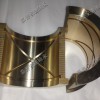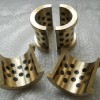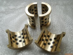 結構是銅合金高力黃銅{ZCuZn25Al6Fe3Mn4(主要化學成份 Cu Al Mn Fe Ni Zn 百分比分別為:60~66% 5.0~7.5% 2.5~5.0% 2.0~4.0% 0.2~0.5% 22~28% .)}基體上鑲嵌固體潤滑劑,經過多道機械加工工序,剖分成兩個半圓。由于其兩端都有法蘭,所以無法從座孔的端面安裝,只能通過剖分成兩個半圓,在安裝時再合成一個整體。